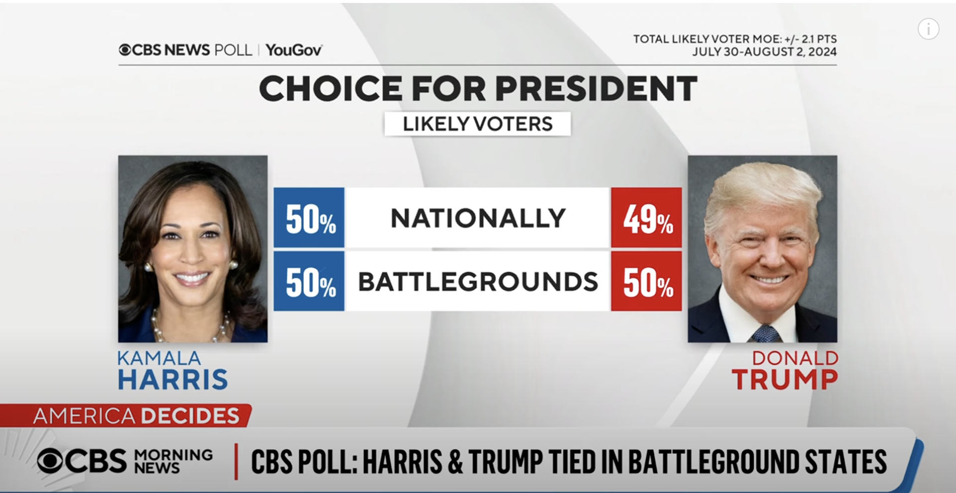 Politics Harris, Trump tied in battleground states, CBS News poll shows Published 2 years ago on August 5, 2024 By Bella May Share Tweet Related Topics:2024 Presidential CampaignFormer President Donald TrumpPoliticsVP Harris Up Next Special Report: Kamala Harris picks Minnesota Gov. Tim Walz as running mate Don't Miss Thousands in streets in Venezuela demanding President Maduro step aside Continue Reading You may like Deploying the National Guard to ‘every major American city’ ‘not sustainable’ Trump imposes tariffs against China, Mexico and Canada Trump holding off on tariffs against Colombia after it accepts flights of deported migrants Rev. Al Sharpton says, “We’re not going back” Trump delivers inauguration address as 47th U.S. president Biden pardons family members minutes before Trump sworn in Politics Zohran Mamdani to win New York City mayoral race Published 4 months ago on November 4, 2025 By Neil Foote Continue Reading Politics Congressional Black Caucus Special Order Hour on Government Funding Deadline Published 6 months ago on September 16, 2025 By Neil Foote Continue Reading Politics Charlie Kirk’s suspected killer to make first court appearance Published 6 months ago on September 16, 2025 By Neil Foote Continue Reading Advertisement Latest Trending Videos National1 month ago Dr. Rashad Richey Offers Exclusive Analysis on Veteran Slade Douglas $6.8mm Verdict National2 months ago Slade Douglas Offers Detailed Analysis of Case Justice2 months ago Black Army Vet Wins $6.8M vs LAPD Business2 years ago New Federal Rules Unveiled to Crack Down on Airline ‘Junk Fees’ Business1 year ago Boris Kodjoe on the Power of Connecting DNC2 years ago Terry McAuliffe Discusses Presidential Politics Politics2 years ago Reflecting on South Africa’s Historic Election Anniversary: Why It’s Poignant This Year Congress2 years ago GOP Lawmakers Clash Over Senator Johnson’s Handling of Foreign Aid Package Business2 years ago New Federal Rules Unveiled to Crack Down on Airline ‘Junk Fees’ Trending