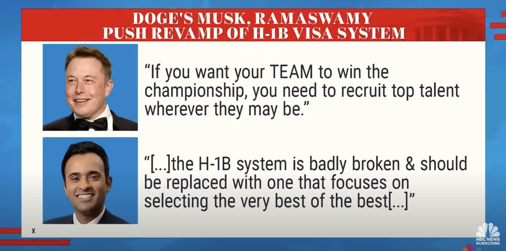 Politics Musk and Ramaswamy open rift with MAGA loyalists over skilled worker visas Published 1 year ago on December 28, 2024 By Bella May Share Tweet Related Topics:Politics Up Next Connecticut AG vows to be ‘first to sue’ to stop Trump from ending birthright citizenship Don't Miss Trump picks ambassador to Panama, suggests US should control Panama Canal Continue Reading You may like Deploying the National Guard to ‘every major American city’ ‘not sustainable’ Trump imposes tariffs against China, Mexico and Canada Trump holding off on tariffs against Colombia after it accepts flights of deported migrants Rev. Al Sharpton says, “We’re not going back” Trump delivers inauguration address as 47th U.S. president Biden pardons family members minutes before Trump sworn in Politics Zohran Mamdani to win New York City mayoral race Published 4 months ago on November 4, 2025 By Neil Foote Continue Reading Politics Congressional Black Caucus Special Order Hour on Government Funding Deadline Published 6 months ago on September 16, 2025 By Neil Foote Continue Reading Politics Charlie Kirk’s suspected killer to make first court appearance Published 6 months ago on September 16, 2025 By Neil Foote Continue Reading Advertisement Latest Trending Videos National1 month ago Dr. Rashad Richey Offers Exclusive Analysis on Veteran Slade Douglas $6.8mm Verdict National2 months ago Slade Douglas Offers Detailed Analysis of Case Justice2 months ago Black Army Vet Wins $6.8M vs LAPD Business2 years ago New Federal Rules Unveiled to Crack Down on Airline ‘Junk Fees’ Business1 year ago Boris Kodjoe on the Power of Connecting DNC2 years ago Terry McAuliffe Discusses Presidential Politics Politics2 years ago Reflecting on South Africa’s Historic Election Anniversary: Why It’s Poignant This Year Congress2 years ago GOP Lawmakers Clash Over Senator Johnson’s Handling of Foreign Aid Package Business2 years ago New Federal Rules Unveiled to Crack Down on Airline ‘Junk Fees’ Trending